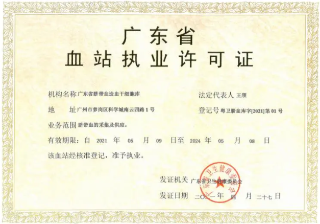 广东省脐血库于2006年获得卫生部颁发的《血站执业许可证》,并连续通过每三年的再执业验收检查,是目前我国储存能力最大的脐血库,面积达15000平方米,储存能力为150万份。截至2021年3月31日,广东省脐血库已出库2844份脐血,救助了2317位患者。