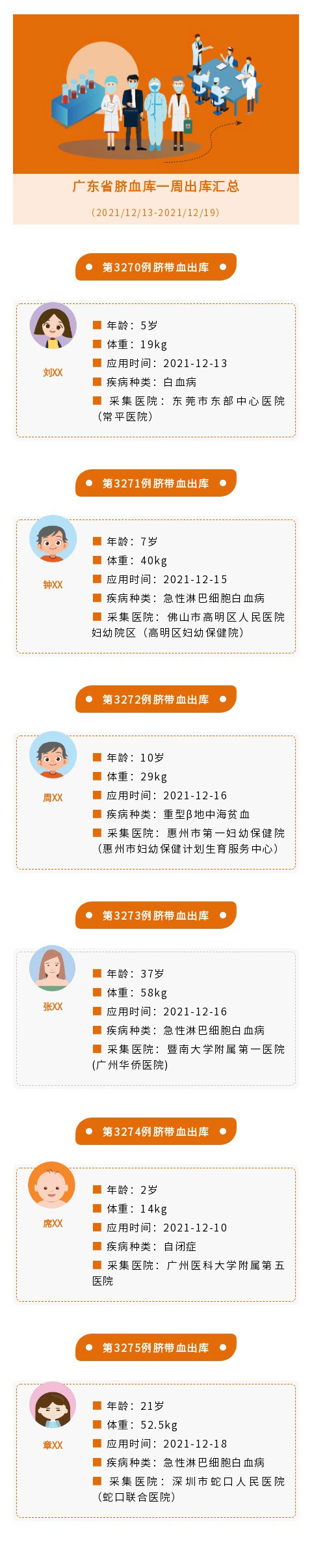 本周共出库6份脐血用于多种疾病的临床应用,主要包括急性淋巴细胞白血病、白血病、重型β地中海贫血及自闭症等疾病治疗。