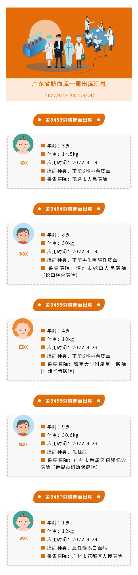 本周共出库5份脐血用于多种疾病的临床应用,主要包括重型β地中海贫血、重型再生障碍性贫血、孤独症及急性髓系白血病等疾病治疗。