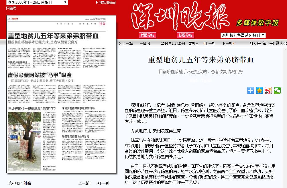 深圳晚报讯 (记者 周倩 通讯员 黄丽娟)经过5年多的等待,身患重型地中海贫血的陈嘉迎来重生希望。近日,陈嘉在深圳市儿童医院进行了脐带血移植手术,输入了来自同胞弟弟陈铮的脐带血,一份承载着亲情和希望的“生命种子”在他体内等待发芽、成长。