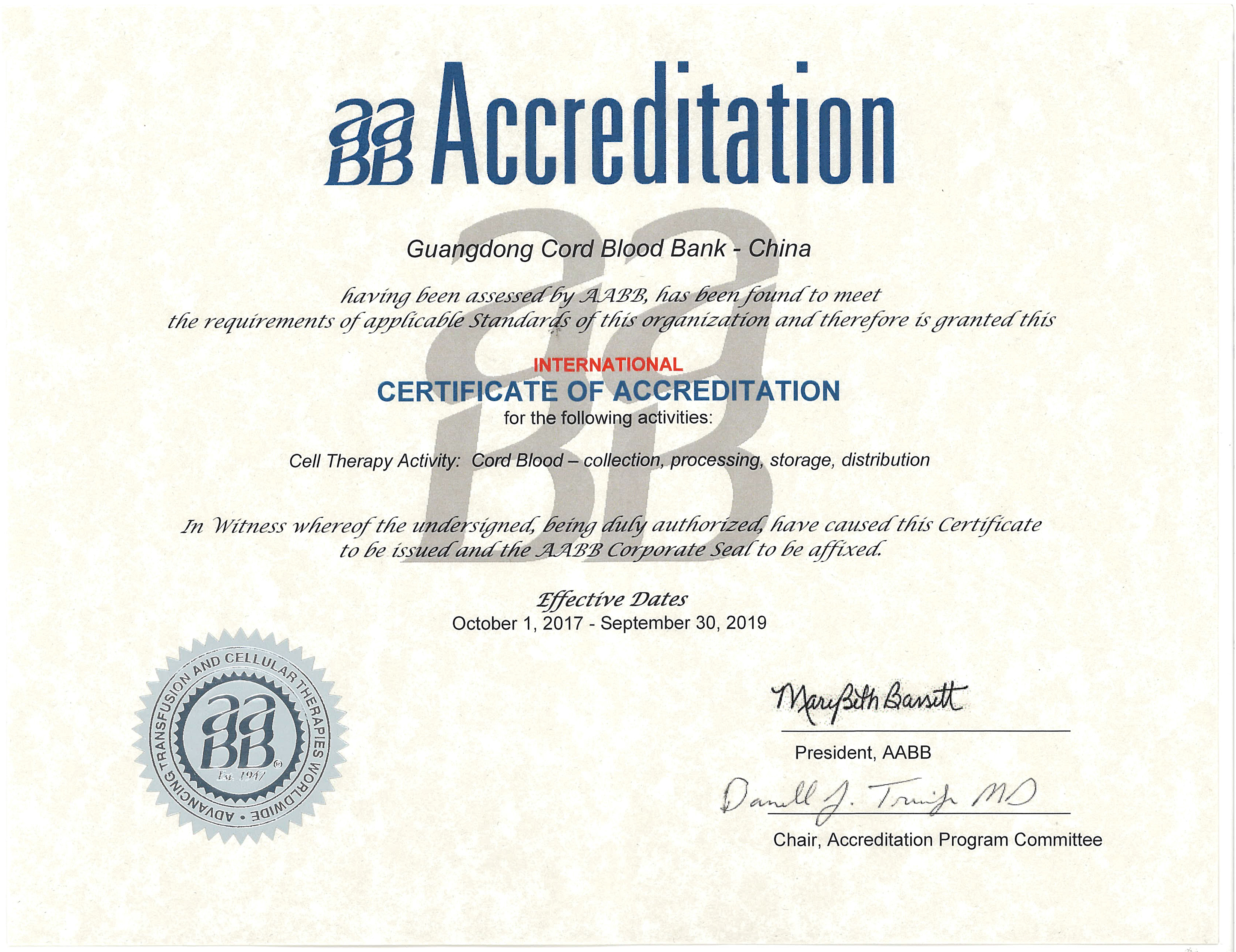广东省脐血库一直秉承“血液无小事,人人有大爱”质量大义,致力于高质量、高标准地采集、冻存并为医疗机构提供脐血用于临床治疗。为更好地保障脐血质量,广东省脐血库在严格遵循国家相关血液标准规范的前提下,不断提高自身要求,于2013年启动AABB认证项目,并于2015年10月成功通过AABB认证。