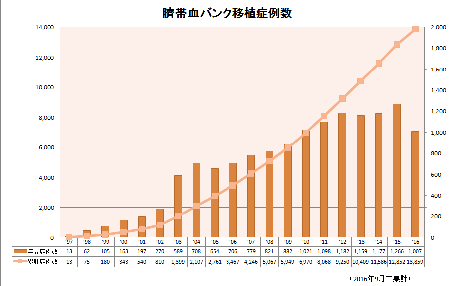 我们再来看看国外脐血移植情况。从美国国家骨髓捐赠者计划Bethelmatch网站(https://bethematchclinical.org/resources-and-education/hct-presentation-slides/#898/)提供的资料(图2)可以看出,美国脐血移植整体上呈上升趋势,2015年约1000例;日本脐血移植总体上也是呈上升趋势,日本骨髓库造血幹細胞移植情報サービス(http://www.bmdc.jrc.or.jp/medicalpersonnel/statistics.html#an3)数据显示,2015年达1266例,2016年截止到9月已经达到1007例,照此趋势2016年全年有望达到1400例(图3)。