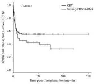 孙教授所带领的研究团队今年7月4日在《Bone Marrow Transplant》上发表文章《Clinical separation of cGvHD and GvL and better GvHD-free/relapse-free survival (GRFS) after unrelated cord blood transplantation for AML》,做了非血缘脐血移植和HLA同胞相合的外周血或骨髓来源的造血干细胞移植治疗AML的比较。结果表明,无论是总生存率(Overall survival,OS),还是无移植物抗宿主病无复发生存率( GvHD-free/relapse-free survival ,GRFS)前者都优于后者(见图4、图5)。