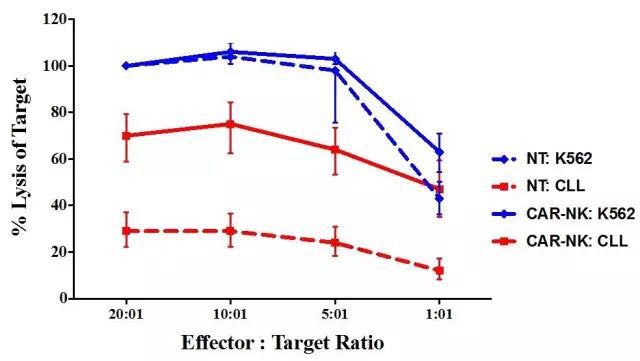 图2 未感染CB-NK(NT)细胞和基因修饰后的CB-NK(CAR-NK)细胞对原代白血病细胞CLL细胞系的杀伤效率
