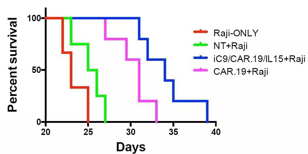 图3未感染CB-NK(NT)细胞、基因修饰后的CB-NK(iC9/CAR.19/IL-15)细胞及CAR-19基因修饰的CB-NK(CAR.19)细胞治疗Raji细胞移植瘤小鼠模型的生存期对比