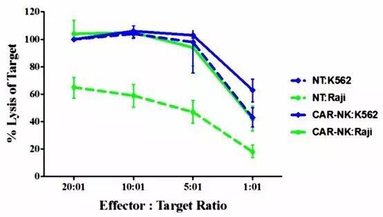图1 未感染CB-NK(NT)细胞和基因修饰后的CB-NK(CAR-NK)细胞对CD19+ Raji细胞的杀伤效率