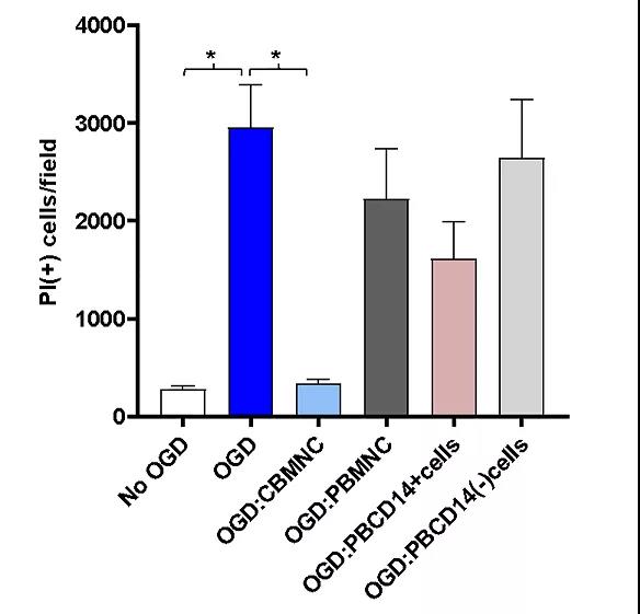 研究者将小鼠脑器官切片培养物暴露于糖氧剥夺(OGD),然后用来自脐带血或成人外周血的细胞处理脑切片。结果发现,脐带血MNC能保护神经元免受OGD诱导的死亡,并减少小胶质细胞和星形胶质细胞的活化。另一方面,成人外周血MNC没能表现出类似的作用。