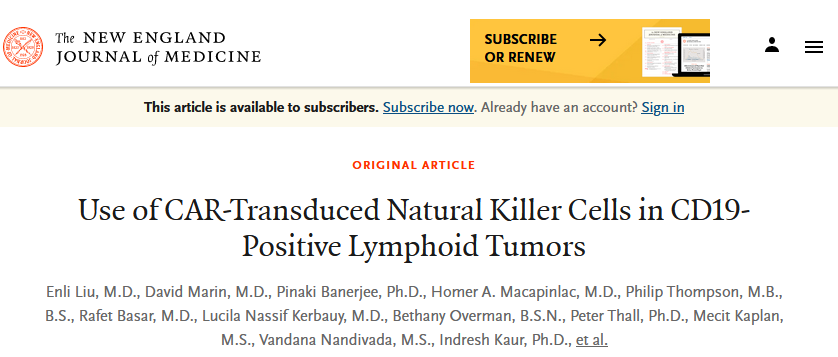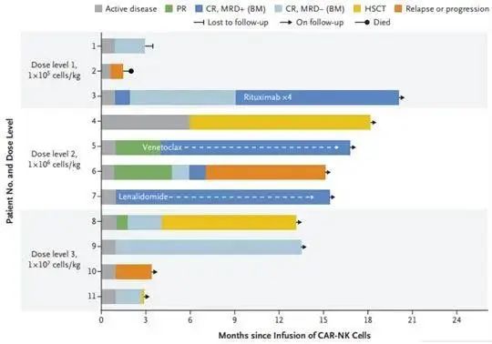 在参与这项临床研究的11名患者中,8人(73%)对CAR-NK治疗有反应,其中7人完全缓解,而没有出现重大毒性作用。并且在所有剂量水平输注3天内可见,注入的CAR-NK细胞扩增并以低水平持续至少12个月。
