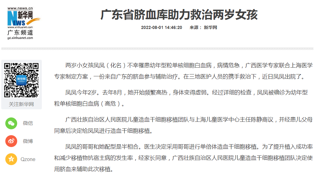 两岁小女孩凤凤(化名)不幸罹患幼年型粒单核细胞白血病,病情危急,广西医学专家联合上海医学专家制定方案,一份来自广东的脐血参与辅助治疗。在三地医护人员的携手救治下,近日凤凤出院了。