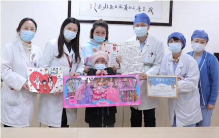 2021年11月25日,在复旦大学附属儿科医院,医护人员为7岁女孩琪琪(化名)举办了一场顺利出院获得新生的庆祝仪式。