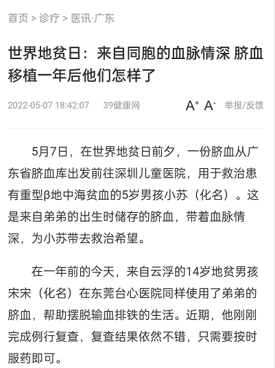 截至2022年4月30日,广东省脐血库已经出库563份脐血用于救治地中海贫血患儿,其中来自自体库的同胞、亲缘间救治达到194份。