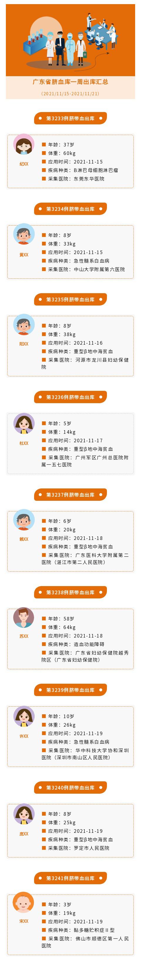 本周共出库9份脐血用于多种疾病的临床应用,主要包括重型β地中海贫血、急性髓系白血病、黏多糖贮积症Ⅱ型、B淋巴母细胞淋巴瘤及造血功能障碍等疾病治疗。