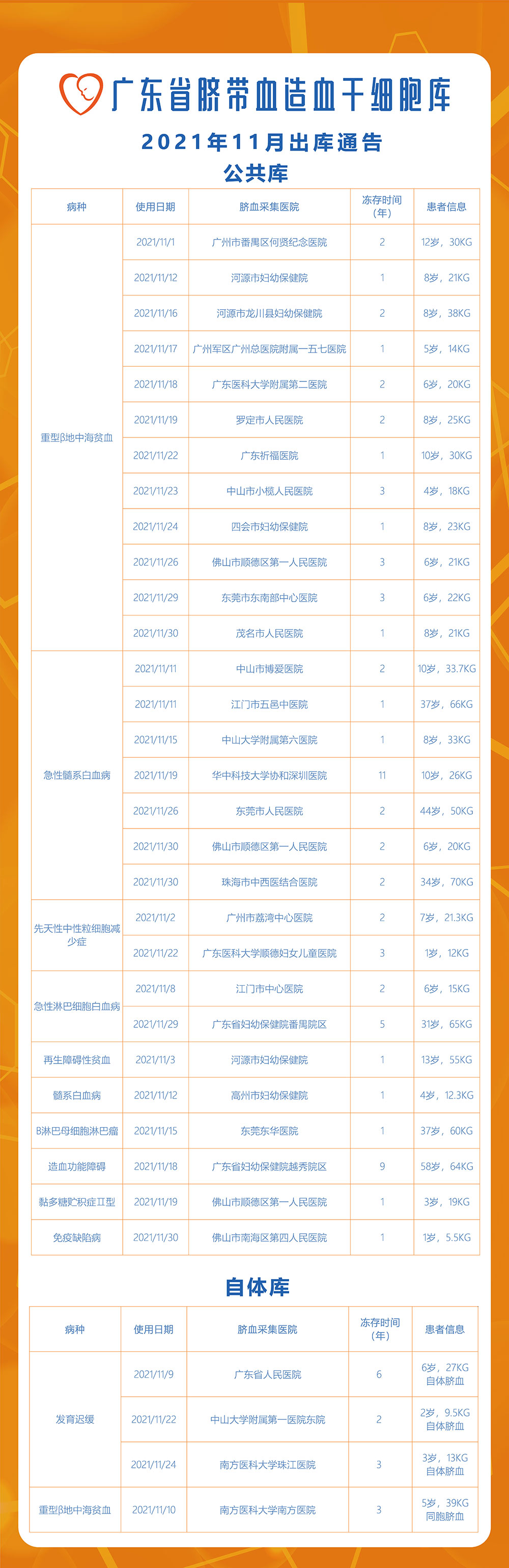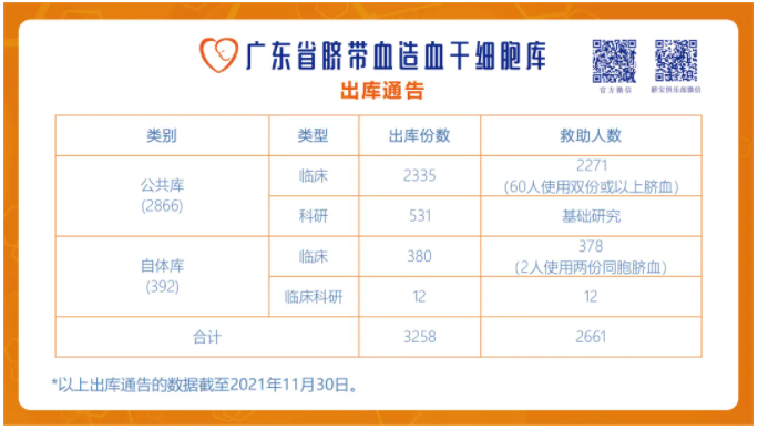截至2021年11月30日,广东省脐血库已出库3258份脐血,救助2661位患者。