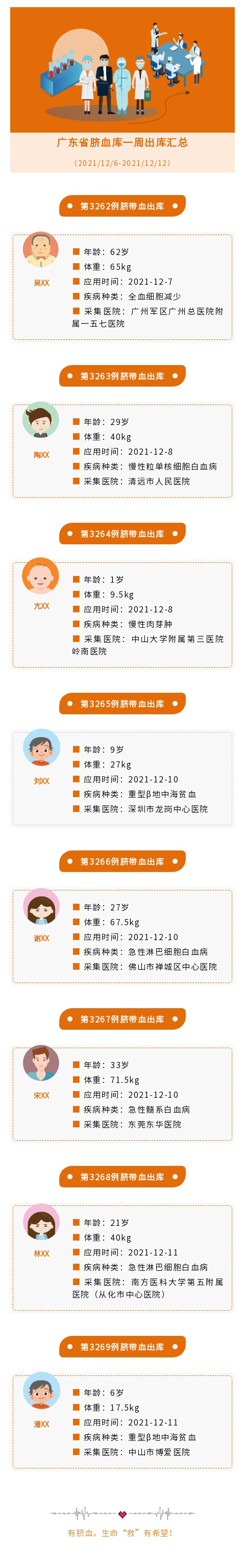 本周共出库8份脐血用于多种疾病的临床应用,主要包括重型β地中海贫血、急性淋巴细胞白血病、急性髓系白血病及全血细胞减少等疾病治疗。