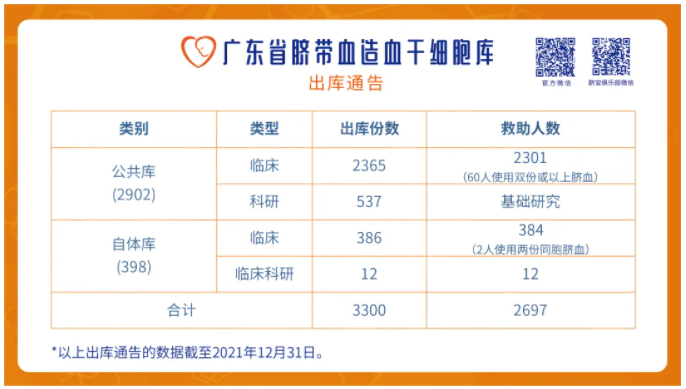 截至2021年12月31日,广东省脐血库已出库3300份脐血,救助2697位患者。