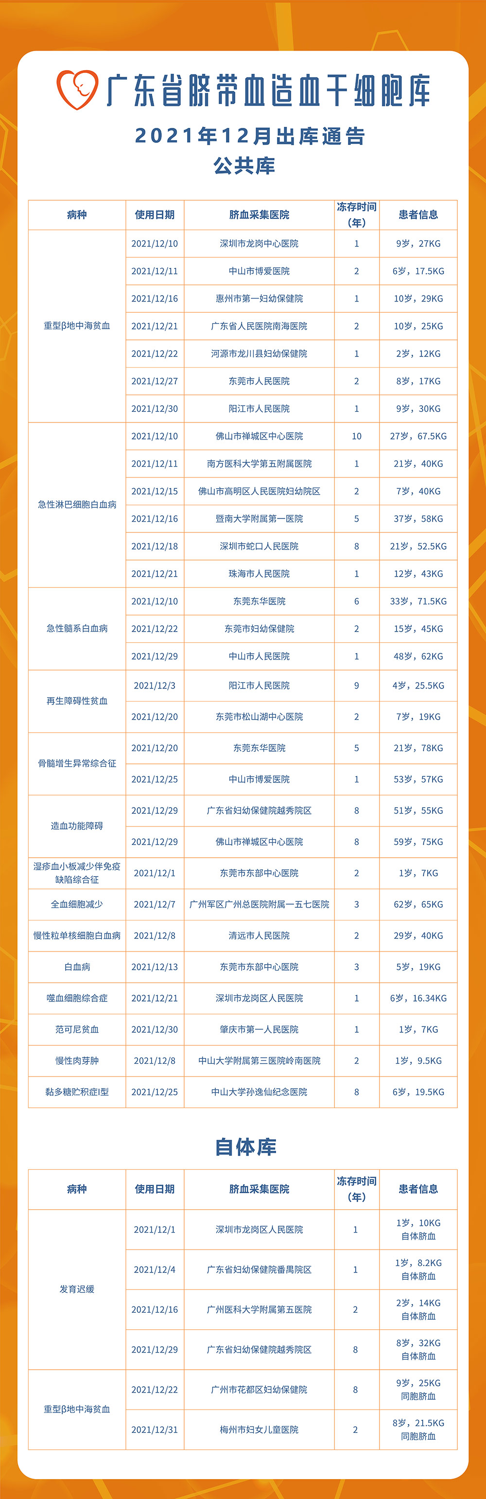 广东省脐血库12月共出库脐血36份,用于多种疾病的临床应用,涉及重型β地中海贫血、急性淋巴细胞白血病、急性髓系白血病、再生障碍性贫血、骨髓增生异常综合征、造血功能障碍、湿疹血小板减少伴免疫缺陷综合征、全血细胞减少、慢性粒单核细胞白血病、白血病、噬血细胞综合症、范可尼贫血、慢性肉芽肿、黏多糖贮积症I型、发育迟缓。