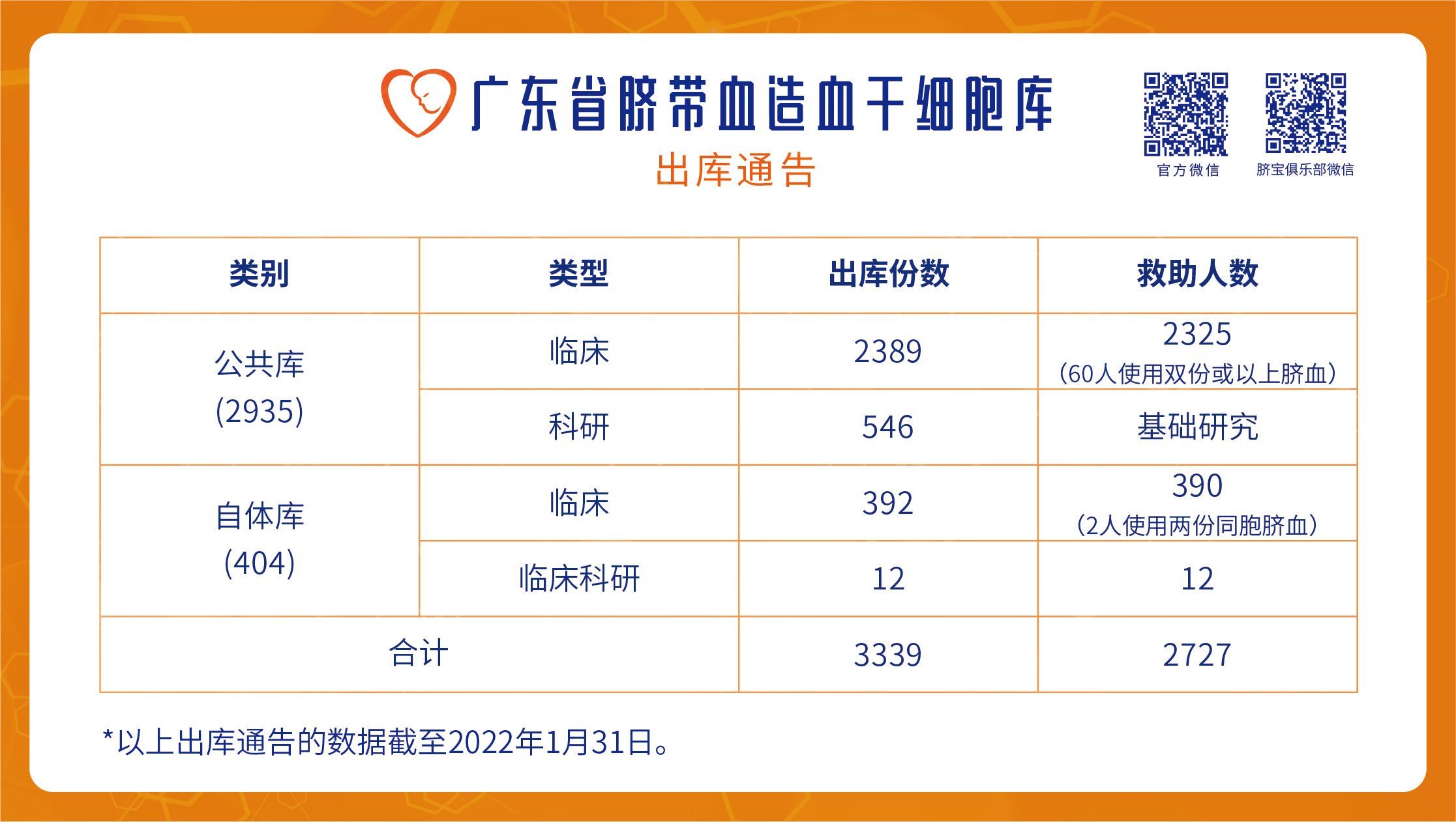 截至2022年1月31日,广东省脐血库已出库3339份脐血,救助2727位患者。