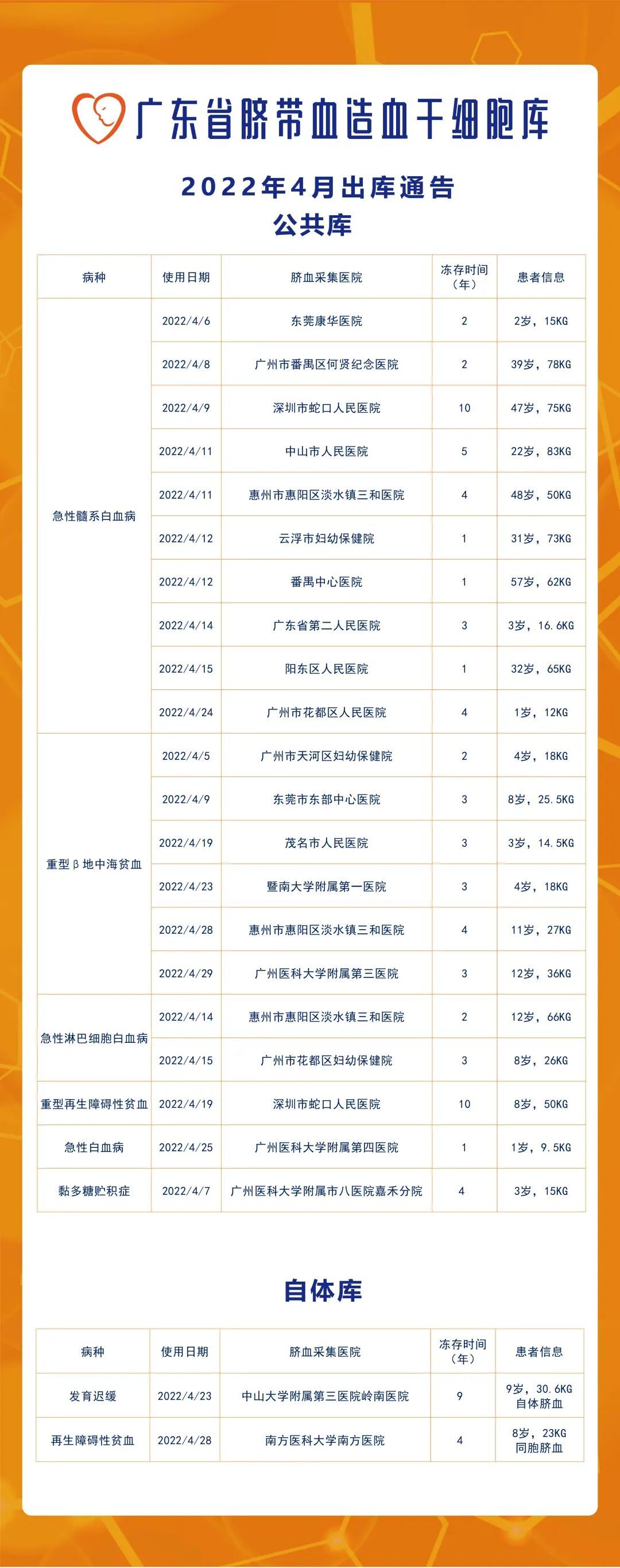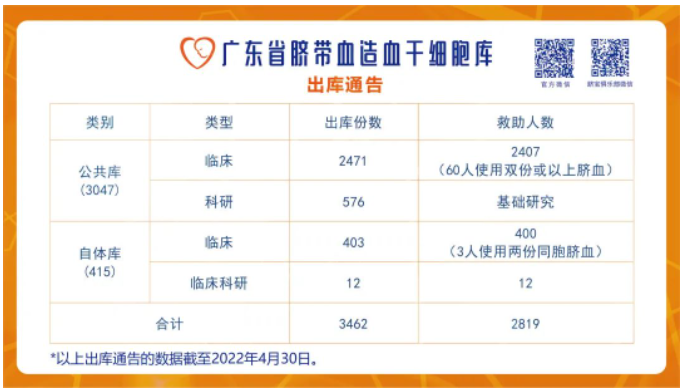 截至2022年4月30日,广东省脐血库已出库3462份脐血,救助2819位患者。广东省脐血库4月共出库23份脐血用于多种疾病的临床应用。