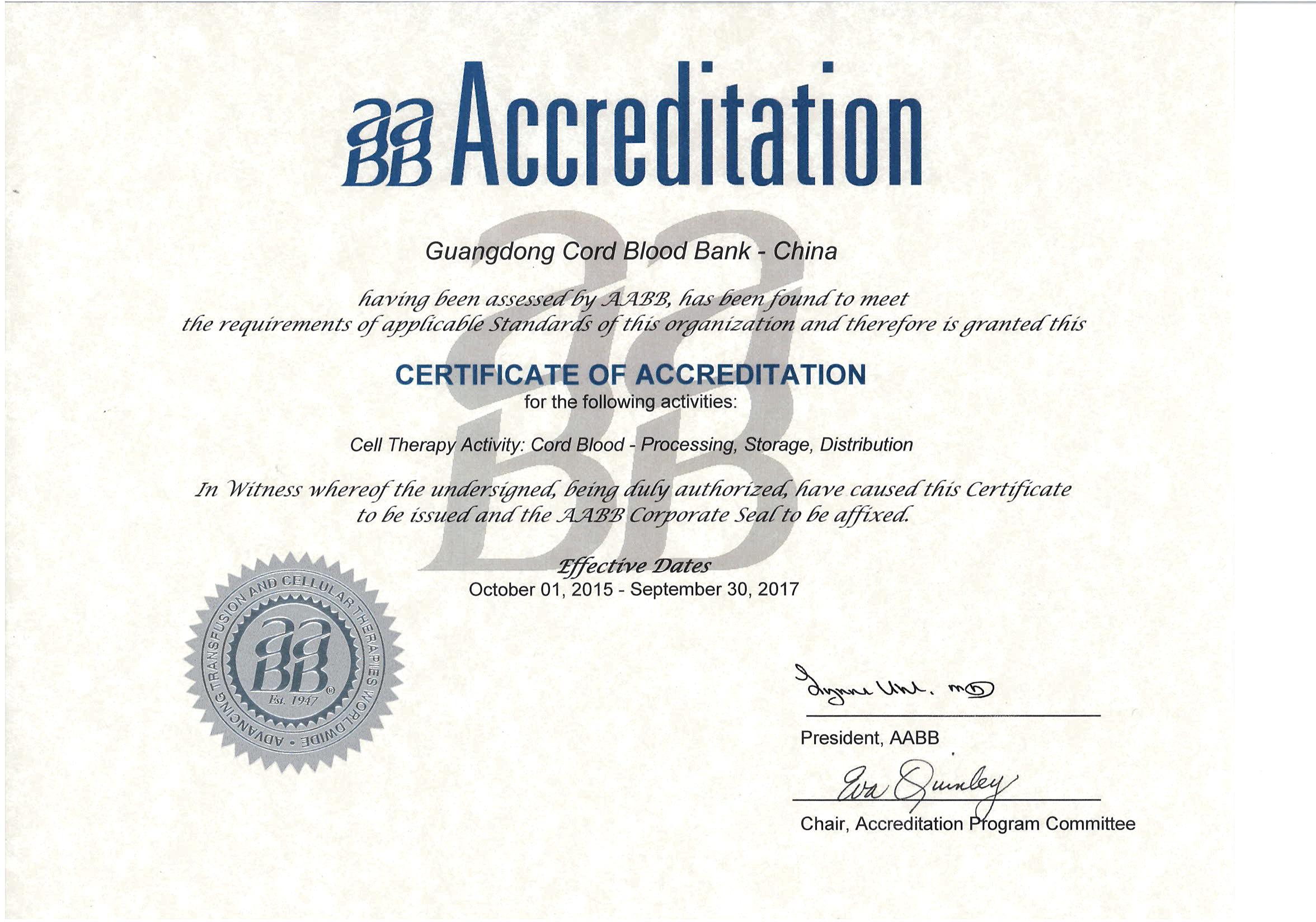 自2013年4月启动AABB认证项目以来,广东省脐血库耗时30个月,于今年9月上旬通过现场审核,最终获得AABB认证。