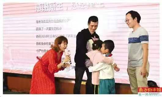 患者小严(化名)和提供脐血帮助自己治病的小男孩拥抱。