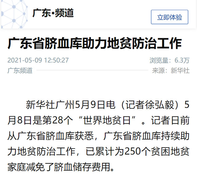 新华社广州5月9日电(记者徐弘毅)5月8日是第28个“世界地贫日”。记者日前从广东省脐血库获悉,广东省脐血库持续助力地贫防治工作,已累计为250个贫困地贫家庭减免了脐血储存费用。