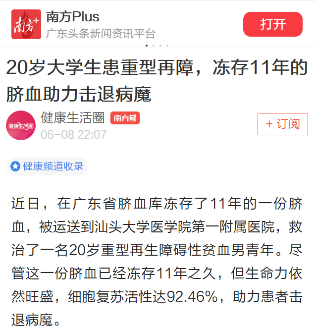 近日,在广东省脐血库冻存了11年的一份脐血,被运送到汕头大学医学院第一附属医院,救治了一名20岁重型再生障碍性贫血男青年。尽管这一份脐血已经冻存11年之久,但生命力依然旺盛,细胞复苏活性达92.46%,助力患者击退病魔。