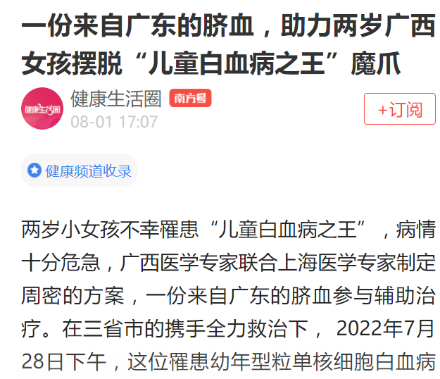 两岁小女孩不幸罹患“儿童白血病之王”,病情十分危急,广西医学专家联合上海医学专家制定周密的方案,一份来自广东的脐血参与辅助治疗。在三省市的携手全力救治下, 2022年7月28日下午,这位罹患幼年型粒单核细胞白血病的女孩凤凤(化名)在广西壮族自治区人民医院顺利出院了。
