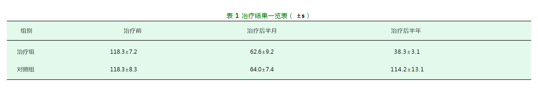 对照组在单纯药物治疗半月后,神经功能障碍改善,治疗半年后,症状出现反复,最终与治疗前相比,神经功能改善不明显。两组间比较,在半月时无显著性差别。半年时两组间有极显著性差别,移植治疗组较对照组神经功能改善明显。