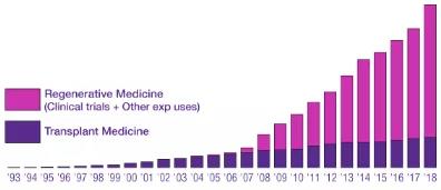 作为造血干细胞的重要来源之一,脐带血干细胞也成了再生医学研究的热门。到目前为止,CBR超过80%的出库脐带血都用在了再生医学领域。