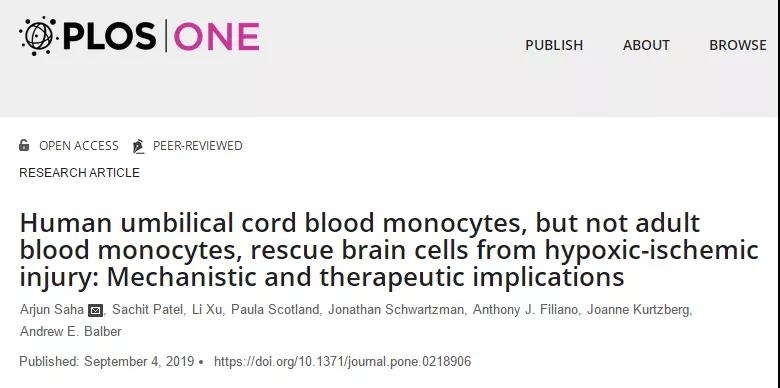 该研究结果于2019年9月4日在线发表在Plos One期刊上,题为:“人类脐带血单核细胞(而非成人外周血单核细胞)保护脑细胞免于缺氧缺血性损伤:机制和治疗意义”。
