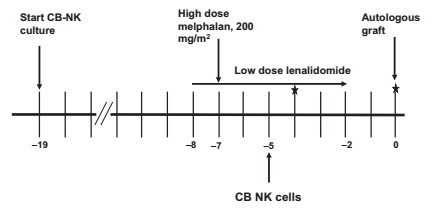 脐带血自然杀伤(CB-NK)细胞培养在第-19天开始。 患者在第-7天用高剂量美法仑,从第-8天至第-2天接受低剂量的来那度胺。 在第-5天输注CB-NK细胞,在第0天输注自体造血干细胞。 星号表示相关分析的时间,此后每周继续进行。