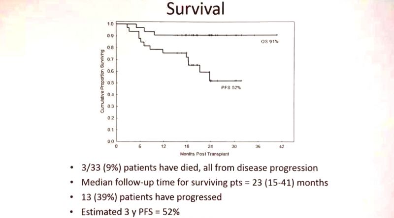 将脐带血来源的NK细胞在体外扩增到1×10^8细胞/kg,再联合自体外周血造血干细胞移植治疗33例高危多发性骨髓瘤。79%患者获得了完全缓解或很好的部分缓解,3年无进展生存率可达52%。