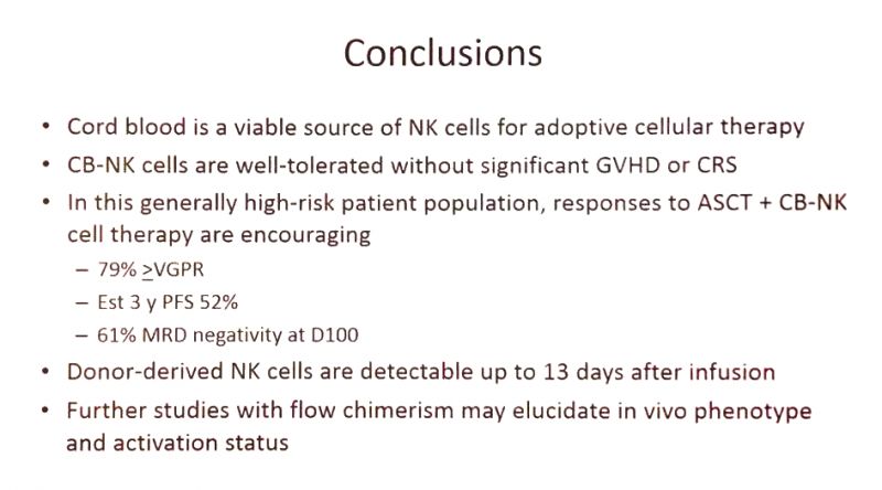 在这项I期临床试验中,10名患者获得了非常好的部分缓解,其中8名患者接近完全缓解或更好。在6名患者体内检测到CB-NK细胞,具有活化的表型。没有发生输注毒性及移植物抗宿主病。在美国临床肿瘤医学会2018年会上Nina Shah 博士公布了这项研究的后续II期临床试验成果。