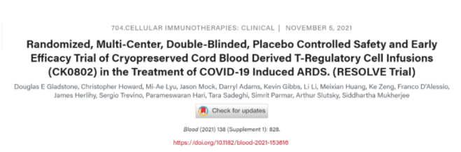 无独有偶,来自美国德克萨斯州的Cellenkos生物技术研发公司也在利用脐血作为原材料,开发创新的,细胞治疗产品。通过与安德森癌症中心合作专注于开发用于治疗自身免疫性疾病和炎症性疾病的T-调节(“T-reg”)细胞疗法。以抑制COVID-19(新冠)急性呼吸窘迫综合征(ARDS)。其核心产品之一CK0802已经完成了Ⅰ期,双盲,随机,安慰剂对照安全性和早期疗效试验[2],用于治疗45例患者中COVID-19诱导的ARDS。该试验的结果表明,CK0802输注具有良好的耐受性,1亿个细胞剂量可能与第28天存活和拔管的主要终点的改善以及最后随访的总生存期的改善有关,展现出脐血T-reg细胞在对抗新冠并发症的有效效果。